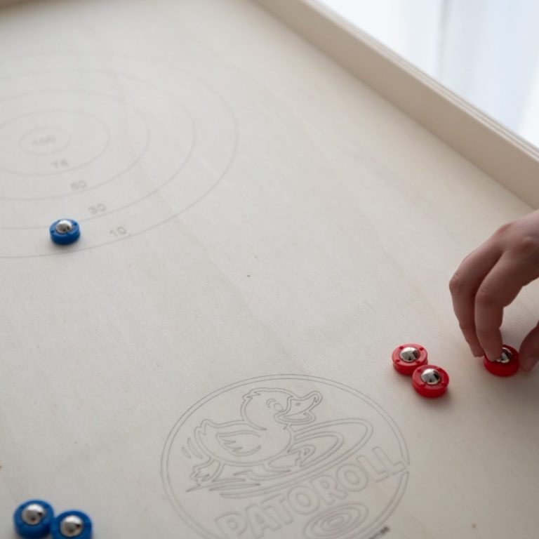 Lanza las fichas con la goma y pásalas al campo rival. Un juego rápido, adictivo y muy competitivo donde gana quien se queda sin fichas primero.